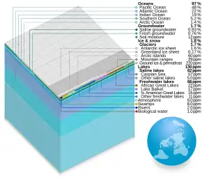 Visualisation of the distribution (by volume) of water on Earth[a]
