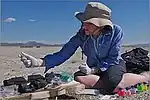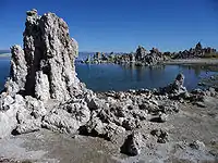 The GFAJ-1 bacterium was discovered by geomicrobiologist Felisa Wolfe-Simon, a NASA astrobiology fellow in residence at the US Geological Survey in Menlo Park, California.[8] GFAJ stands for "Give Felisa a Job".[9] The organism was isolated and cultured beginning in 2009 from samples she and her colleagues collected from sediments at the bottom of Mono Lake, California, U.S.A.[10] Mono Lake is hypersaline (about 90 grams/liter) and highly alkaline (pH 9.8).[11] It also has one of the highest natural concentrations of arsenic in the world (200 μM).[1] The discovery was widely publicized on 2 December 2010.[2]