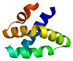 Granulysin has a five alpha-helix structure, and is part of the saposin-like protein family.[5] It is expressed in 2 forms: a 15kDa precursor protein, the translation product, and a 9kDa cytotoxic protein, which is formed after cleavage of the amino and carbonyl ends of the 15kDa protein.[5][4][3]