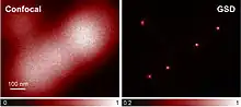 Ground state depletion microscopy (GSD microscopy) is an implementation of the RESOLFT concept. The method was proposed in 1995[1] and experimentally demonstrated in 2007.[2] It is the second concept to overcome the diffraction barrier in far-field optical microscopy published by Stefan Hell. Using nitrogen-vacancy centers in diamonds a resolution of up to 7.8 nm was achieved in 2009.[3] This is far below the diffraction limit (~200 nm).