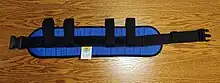 Gait belts are worn around a patient's waist.[1] Their purpose is to put less strain on the lumbar spine of the patient as the caregiver(s) are transporting the patient. Gait belts are used in nursing homes, hospitals, or other similar facilities. It is a 2-inch-wide (5 cm) belt, with or without handles. The gait belt must always be applied on top of clothing or gown to protect the patient's skin. A gait belt can be used with patients in both one-person or two-person pivot transfer, or in transfer with a slider board.[2]