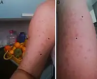 - ↑ Santana, Aline Palitot; Cardoso, Alberto Eduardo Cox; Passos, Rafaela Tenório; Ferreira, Íris Sampaio Costa (2020-03-01). "Case for diagnosis. Erythematous and pruritic papules on forearms". Anais Brasileiros de Dermatologia. 95 (2): 250–251. doi:10.1016/j.abd.2019.06.006. PMC 7175029. PMID 32171542.