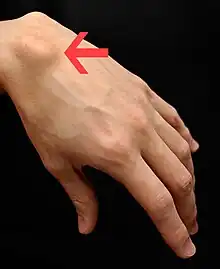 A ganglion cyst is a fluid-filled bump associated with a joint or tendon sheath.[3] It most often occurs at the back of the wrist, followed by the front of the wrist.[3][4]