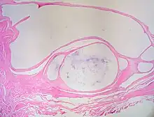 The most commonly accepted probable cause of ganglion cysts is the herniation hypothesis, by which they are thought to occur as an out-pouching or distention of a weakened portion of a joint capsule or tendon sheath. This description is based on the observations that the cysts occur close to tendons and joints. The microscopic anatomy of the cyst resembles that of tenosynovial tissue. The fluid is similar in composition to synovial fluid. Dye injected into the joint frequently ends up in the cyst. Dye injected into the cyst rarely enters the joint, however, which has been attributed to the apparent formation of an effective and one-way "check valve", allowing fluid out of the joint, but not back in.[6]