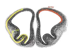 The primary purpose of the MGE during development is to produce GABAergic stellate cells and direct their migration to the neocortex.[6] The precursors of most GABAergic interneurons in the cerebral cortex migrate from the subcortical progenitor zone. More specifically, performing a mechanical transection of the migratory route from the MGE to the neocortex causes a 33% decrease in GABAergic interneurons in the neocortex.[6] The MGE also produces some of the neurons and glia of the basal ganglia and hippocampus.[6][7] The MGE may also be a source of Cajal-Retzius cells, but this remains controversial.[6] Early in embryonic development, the interneurons in the cortex stem primarily from the MGE[8] and the AEP. In vitro experiments show that MGE cells migrate more than 300 μm per day, three times faster than the migration of LGE cells.[2] See more about the time frame and function of MGE in comparison to the LGE in the following section.