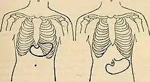 The condition frequently causes digestive symptoms, epigastric pain, constipation, decreased appetite, and sometimes even gastric emptying disorders.[2] It is much more prominent in women than men, and is diagnosed with x-ray using barium contrast.[1][3] Gastroptosis is mainly caused by the relaxation of surrounding ligaments and mesenteries as a result of the weight of the stomach.[4]