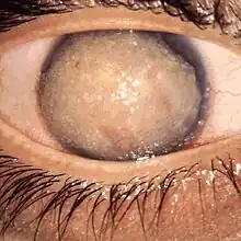 | A completely opaque cornea with multiple drop-like nodular opacities. Some blood vessels are present in the opaque cornea | |