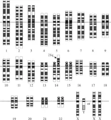 - ↑ For a description of human karyotype see Mitelman, F. (1995). ISCN 1995 : an international system for human cytogenetic nomenclature (1995) : recommendations of the International Standing Committee on Human Cytogenetic Nomenclature, Memphis, Tennessee, USA, October 9-13, 1994.