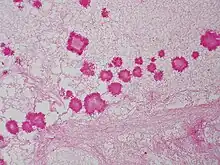 Geotrichum candidum is also a frequent member of the human microbiome, notably associated with skin, sputum and feces where it occurs in 25-30% of specimens.[2][3] The fungus can cause an infection known as geotrichosis, affecting the oral, bronchial, skin and bronchopulmonary epithelia.[2] The inoculum may arise from endogenous or exogenous sources.
