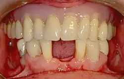 Dentures are prosthetic appliances fabricated to fill the gaps of missing teeth. Conventional style dentures are removable appliances and are designed to be either a complete denture or a partial denture anchoring to adjacent teeth. There are many denture designs, some which rely on chemical bonding or clasping onto teeth or attached via dental implants known as fixed prosthodontics.[12]