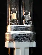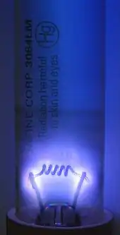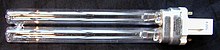 The most common form of germicidal lamp looks similar to an ordinary fluorescent lamp but the tube contains no fluorescent phosphor. In addition, rather than being made of ordinary borosilicate glass, the tube is made of fused quartz or vycor 7913[1] glass. These two changes combine to allow the 253.7 nm ultraviolet light produced by the mercury arc to pass out of the lamp unmodified (whereas, in common fluorescent lamps, it causes the phosphor to fluoresce, producing visible light). Germicidal lamps still produce a small amount of visible light due to other mercury radiation bands.
