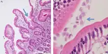 The attachment of trophozoites causes villous flattening and inhibition of enzymes that break down disaccharide sugars in the intestines.[7][22] Ultimately, the community of microorganisms that lives in the intestine may overgrow and may be the cause of further symptoms, though this idea has not been fully investigated. The alteration of the villi leads to an inability of nutrient and water absorption from the intestine, resulting in diarrhoea, one of the predominant symptoms.[22] In the case of asymptomatic giardiasis, there can be malabsorption with or without histological changes to the small intestine. The degree to which malabsorption occurs in symptomatic and asymptomatic cases is highly varied.