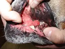 It is commonly seen in Boxer dogs and other brachycephalic breeds,[22] and in the English Springer Spaniel.[23] It usually starts around middle age and progresses. Some areas of the gingiva can become quite large but have only a small attachment to the rest of the gingiva, and it may completely cover the teeth. Infection and inflammation of the gingiva is common with this condition. Under anesthesia, the enlarged areas of gingiva can be cut back with a scalpel blade or CO2 laser, but it often recurs.[24] Gingival enlargement is also a potential sequela of gingivitis. As in humans, it may be seen as a side effect to the use of ciclosporin.[25]