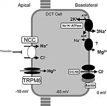 - 1 2 Franken GA, Adella A, Bindels RJ, de Baaij JH (February 2021). "Mechanisms coupling sodium and magnesium reabsorption in the distal convoluted tubule of the kidney". Acta Physiologica. 231 (2): e13528. doi:10.1111/apha.13528. PMC 7816272. PMID 32603001.
