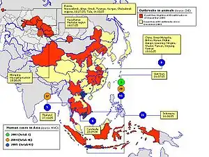 The epicenters of both the Asian influenza pandemic of 1957 and the Hong Kong influenza pandemic of 1968 were in Southeast Asia, and it is in this region that multiple clades of H5N1 influenza virus have already emerged. The Asian H5N1 virus was first detected in Guangdong Province, China, in 1996, when it killed some geese, but it received little attention until it spread through live-poultry markets in Hong Kong to humans in May 1997, killing 6 of 18 infected people. [...] From 1997 to May 2005, H5N1 viruses were largely confined to Southeast Asia, but after they had infected wild birds in Qinghai Lake, China, they rapidly spread westward. [...] The intermittent spread to humans will continue, and the virus will continue to evolve.Map[4]