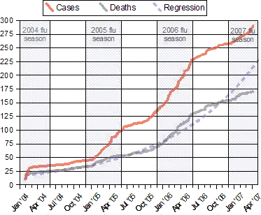 - April 6, 2007: "A 13-year-old Cambodian girl dies from bird flu, bringing the country's death toll from the H5N1 virus to seven."[18]