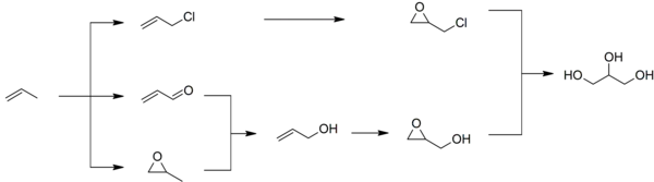 Although usually not economical anymore, glycerol can be synthesized by various routes. During World War II, synthetic glycerol processes became a national defense priority because it is a precursor to nitroglycerine. Epichlorohydrin is the most important precursor. Chlorination of propylene gives allyl chloride, which is oxidized with hypochlorite to dichlorohydrin, which reacts with a strong base to give epichlorohydrin. Epichlorohydrin can be hydrolyzed to glycerol. Chlorine-free processes from propylene include the synthesis of glycerol from acrolein and propylene oxide.[7]