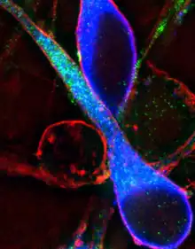 - ↑ Hutchins, BI; Wray, S (2014). "Capture of microtubule plus-ends at the actin cortex promotes axophilic neuronal migration by enhancing microtubule tension in the leading process". Frontiers in Cellular Neuroscience. 8: 400. doi:10.3389/fncel.2014.00400. PMC 4245908. PMID 25505874.