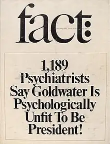 The issue arose in 1964 when Fact magazine published "The Unconscious of a Conservative: A Special Issue on the Mind of Barry Goldwater,"[3][5][6] a play on the title of Goldwater's bestseller The Conscience of a Conservative. The magazine polled psychiatrists about Goldwater and whether he was fit to be president.[7][8] Goldwater sued magazine editor Ralph Ginzburg and managing editor Warren Boroson, and in Goldwater v. Ginzburg (July 1969) received compensation of $75,000 ($643,000 today).[3]