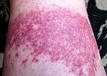 Common signs and symptoms of golfer's vasculitis include a purple-red rash, welting of the skin, and generalized swelling, typically occurring in the legs above the socks.[3][5] Symptoms may or may not include a burning sensation, itching or pain.[3][4]