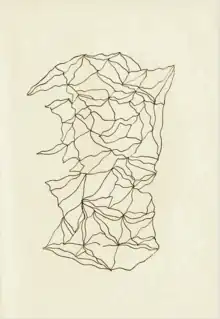 Entopic graphomania is a surrealist drawing exercise designed to highlight patterns and meaning in pieces of paper, including newspapers, blank pieces of copy paper, and pages of a book.[10] The process consists of closely examining a page for distinguishing features (folds, creases, blank spaces) and marking them with a writing utensil. These marks are then connected by any type of line (squiggly, straight, dotted, etc.).