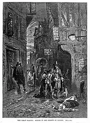 In late 1664, a bright comet was seen in the sky,[11] and the people of London became fearful, wondering what evil event it portended. London at that time was a city of about 448 acres surrounded by a city wall that had originally been built to keep out raiding bands, and, in the south, by the River Thames. There were gates in the wall at Ludgate, Newgate, Aldersgate, Cripplegate, Moorgate, Bishopsgate and Aldgate, and the Thames was crossable at London Bridge.[12] In the poorer parts of the city, filled with overcrowded tenements and garrets, hygiene was impossible to maintain. There was no sanitation, and open drains flowed along the centre of winding streets. The cobbles were slippery with animal droppings, rubbish and the slops thrown out of the houses; they were muddy and buzzing with flies in summer, and awash with sewage in winter. The City Corporation employed "rakers" to remove the worst of the filth, and it was transported to mounds outside the walls, where it accumulated and continued to decompose. The stench was overwhelming, and people walked around with handkerchiefs or nosegays pressed against their nostrils.[13]