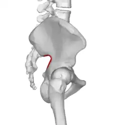![]() Surface of the hip showing the greater sciatic notch in red | |