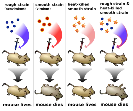 Griffith's experiment,[1] performed by Frederick Griffith and reported in 1928,[2] was the first experiment suggesting that bacteria are capable of transferring genetic information through a process known as transformation.[3][4] Griffith's findings were followed by research in the late 1930s and early 40s that isolated DNA as the material that communicated this genetic information.