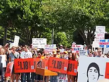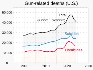 Gun violence in the United States results in tens of thousands of deaths and injuries annually.[106] In 2013, there were 73,505 nonfatal firearm injuries (23.2 injuries per 100,000 U.S. citizens),[107][108] and 33,636 deaths due to "injury by firearms" (10.6 deaths per 100,000 U.S. citizens).[109] These deaths consisted of 11,208 homicides,[110] 21,175 suicides,[109] 505 deaths due to accidental or negligent discharge of a firearm, and 281 deaths due to firearms use with "undetermined intent".[109] Of the 2,596,993 total deaths in the US in 2013, 1.3% were related to firearms.[106][111] The ownership and control of guns are among the most widely debated issues in the country.
