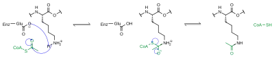 Proteins are typically acetylated on lysine residues, and the acetylation reaction relies on acetyl-coenzyme A as the acetyl group donor. In histone acetylation and deacetylation, histone proteins are acetylated and deacetylated on lysine residues in the N-terminal tail as part of gene regulation. Typically, these reactions are catalyzed by enzymes with histone acetyltransferase (HAT) or histone deacetylase (HDAC) activity, although HATs and HDACs can modify the acetylation status of non-histone proteins as well.[1]
