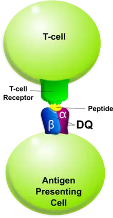 When tolerance to self proteins is lost, DQ may become involved in autoimmune disease. Two autoimmune diseases in which HLA-DQ is involved are coeliac disease and type 1 diabetes. DQ mediates autoimmunity by skewing the T-cell receptor (TCR) repertoire during thymic selection.[1] Carriers of risk serotypes such as DQ8 have a higher proportion of circulating T-cell receptors that may bind insulin, the primary autoantigen in type 1 diabetes.