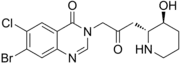 Halofuginone, sold under the brand name Halocur, is a coccidiostat used in veterinary medicine. It is a synthetic halogenated derivative of febrifugine, a natural quinazolinone alkaloid which can be found in the Chinese herb Dichroa febrifuga (Chang Shan).[3] Collgard Biopharmaceuticals is developing halofuginone for the treatment of scleroderma and it has received orphan drug designation from the U.S. Food and Drug Administration.[4]