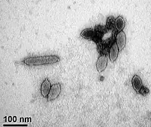 | Transmission electron micrograph of virions, negatively stained with uranyl acetate. Scale bar = 100 nm. | |