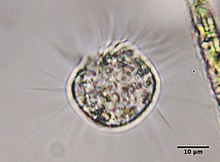 The genus Halteria consists of freshwater ciliates that typically live a planktonic lifestyle. The species Halteria grandinella is considered cosmopolitan, meaning that it is found in habitats across the world.[13] Other species are less common and so they are less well defined, however frequent descriptions of Halteria grandinella have provided insight into the genus as a whole. Halteria are heterotrophic and unlike many closely related genera like Pelagohalteria, they have no photosynthetic endosymbionts. Halteria do frequently eat green algae which, when observed in food vacuoles, has led to misclassifications in the past when mistaken for endosymbionts.[14]