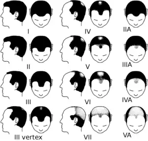 The Hamilton–Norwood scale is used to classify the stages of male pattern baldness. It is a widely accepted and reproducible classification system for male pattern hair loss (androgenetic alopecia). The stages are described with a number from 1 to 7 with a type A variant for the cases with anterior involvement.[1]
