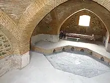 In Iran a shared pool or basin of hot water is commonly present in the middle of the hot room where bathers could immerse themselves, a feature which was rare or absent in the hamams of other regions (except Egypt).[19][6][2] Iranian hammam architecture was also characterised by the polyhedral shape of its rooms (sometimes rectangular but often octagonal or hexagonal), which were covered by a dome with a central skylight. The Iranian hot room (garmkhaneh) was in some cases divided into several rooms: a large main one with a central pool (chal howz) and smaller ones for individual ablutions or which could be used as private rooms for special guests.[21]