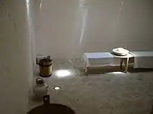 Most historic hammams made use of some version or derivation of the Roman hypocaust underfloor system for heating.[2][3] A furnace or set of furnaces were located in a service room behind the walls of the hot room and set at a lower level than the steam rooms. The furnaces were used to heat water (usually in a large cauldron above them) which was then delivered to the steam rooms. At the same time, hot air and smoke from the furnaces was channeled through pipes or conduits under the floor of the steam rooms, thus heating the rooms, before rising through the walls and out the chimneys. As hot water was constantly needed, they were kept burning throughout the hours of operation. Although wood was continuously needed for fuel, some hammams, such as those in Morocco, Turkey and Damascus, also made use of recycled organic materials from other industries such as wood shavings from carpenters' workshops and olive pits from the olive presses.[3]