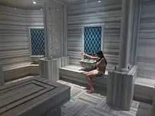 In a modern hammam visitors undress themselves, while retaining some sort of modesty garment or loincloth, and proceed into progressively hotter rooms, inducing perspiration. They are then usually washed by male or female staff (matching the gender of the visitor) with the use of soap and vigorous rubbing, before ending by washing themselves in warm water.[5] Unlike in Roman or Greek baths, bathers usually wash themselves with running water instead of immersing themselves in standing water since this is a requirement of Islam,[3] though immersion in a pool used to be customary in the hammams of some regions such as Iran.[6] While hammams everywhere generally operate in fairly similar ways, there are some regional differences both in usage and architecture.[5]