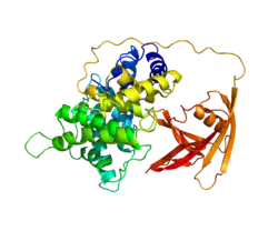 Haptocorrin (HC) also known as transcobalamin-1 (TC-1) or cobalophilin is a transcobalamin protein that in humans is encoded by the TCN1 gene.[3] One essential function of haptocorrin is protection of the acid-sensitive vitamin B12 while it moves through the stomach. A second function is serum HC binding of the great majority of circulating vitamin B12, rendering it unavailable for take-up by cells. This is conjectured to be a circulating storage function.