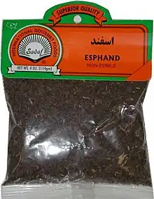 - 1 2 3 Mahmoud Omidsalar Esfand: a common weed found in Persia, Central Asia, and the adjacent areas Encyclopedia Iranica Vol. VIII, Fasc. 6, pp. 583–584. Originally published: 15 December 1998. Online version last updated 19 January 2012