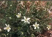 It blooms with solitary flowers[25] opposite to the leaves on the apical parts of branches.[22] It flowers between March and October in India,[27][28][29] between April and October in Pakistan,[2] between May and June in China,[22] between March and April in Israel,[26] and between May and July in Morocco.[30] The flowers are white[2][10][12][31] or yellowish white,[2][22] and are about 2–3 cm in diameter.[2][31] Greenish veins are visible in the petals.[10] They have a threadlike, 1.2 cm long pedicel.[2] The flowers have five (10-)12–15(−20)mm long,[2][12][22] linear, pointy-ended, glabrous sepals, often divided into lobes,[2][22] although sometimes entire and only divided at the end.[2][22] There are five petals which are oblong-elliptic, obovate to oblong in shape, (10-)14–15(−20)mm long, (5-)6–8(−9)mm broad, and ending with an obtuse apex.[2][22] The flowers are hermaphroditic, having both male and female organs.[25] The flowers usually have 15 stamens (rarely fewer);[2][22] these have a 4-5mm long[2] filament with an enlarged base.[10][22] The dorsifixed, 6mm long anthers are longer than the filaments.[2] The ovary is superior,[32] and has 3 locules[22] and ends in an 8-10mm long style, the ending 6mm of which are triangular or 3-keeled in cross-section.[2] The ovary is surrounded by a nectary which is glabrous and has five lobes in a regular pattern.[32]