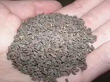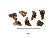 The seeds are colored dark brown[22] to blackish-brown,[2] slightly curved, triangular, about 2 mm (0.08 in) long with a muriculate surface.[2][22] The endosperm is oily.[22]