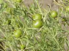 Peganum harmala, commonly called wild rue,[1] Syrian rue,[1] African rue,[1] esfand or espand,[6] or harmel[1] (among other similar pronunciations and spellings), is a perennial, herbaceous plant, with a woody underground rootstock, of the family Nitrariaceae, usually growing in saline soils in temperate desert and Mediterranean regions. Its common English-language name came about because of a resemblance to rue (to which it is not related). Because eating it would sicken or kill livestock, it is considered a noxious weed in a number of countries. It has become an invasive species in some regions of the western United States. The plant is popular in Middle Eastern and north African folk medicine. The alkaloids contained in the plant, including the seeds, are monoamine oxidase inhibitors (Harmine, Harmaline).[7]