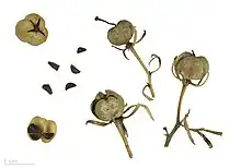 The plant fruits between July and November in China.[22] The fruit is a dry, round seed capsule[2][10][34] which measures about 6–10(−15) mm in diameter,[2][34] These seed capsules have three chambers and carry more than 50 seeds.[2][31] The end of the fruit is usually somewhat sunken inwards[2][12] and retains a persistent style.[2]