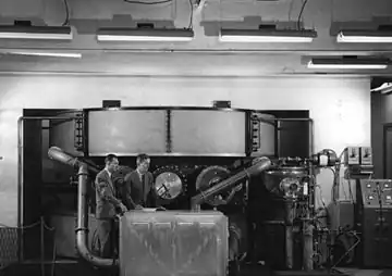 The Harvard Cyclotron Laboratory was built with office of Naval Research funds between 1946 and 1949 to replace an earlier, lower energy, cyclotron that was sent to Los Alamos for use in the Manhattan Project.[2][3] Until 1961, the laboratory primarily performed experiments in physics. The lab performed research and development in particle physics (including particle detectors development and testing), activation analysis, radiobiology, and solid state physics.