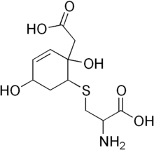 Normally, the breakdown of the amino acid tyrosine involves the conversion of 4-hydroxyphenylpyruvate to homogentisate by 4-hydroxyphenylpyruvate dioxygenase. Complete deficiency of this enzyme would lead to tyrosinemia III. In rare cases, however, the enzyme is still able to produce the reactive intermediate 1,2-epoxyphenyl acetic acid, but is unable to convert this intermediate to homogentisate. The intermediate then spontaneously reacts with glutathione to form 2-L-cystein-S-yl-1,4-dihydroxy-cyclohex-5-en-1-yl acetic acid (hawkinsin).[3][4]