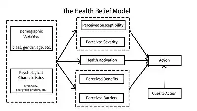 In social psychology, the health belief model (HBM) is a psychological framework used to explain and predict individuals' potentially detrimental behaviors, attitudes and beliefs on their health. Developed in the 1950s by social psychologists at the United States Public Health Service, the model examines how perceptions of susceptibility to illness, the severity of health conditions, the benefits of preventive care, and barriers to healthcare influence behavior. The HBM is widely used in health behavior research and public health interventions to understand and promote engagement in health-protective behaviors.[1][2] It also incorporates concepts similar to the transtheoretical model like self-efficacy, or confidence in one's ability to take action, and identifies the role of cues to action or stimulus, such as health campaigns or medical advice, in prompting behavior change.[3]