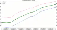 Life expectancy in Australia is among the highest in the world. According to the 2013 Global Burden of Disease Study Australia was ranked third highest in life expectancy.[3] The life expectancy (at birth) in 2015 was estimated to be 79.7 years for males and 84.74 years for females.[4] In 2018 the average number of years a newborn Australian child would live if current mortality patterns were to stay the same was 82.9 years, this has increased from 69.3 years since 1950.[5] In 2015, the crude birth rate was 13.3 per 1,000 people,[6] while the total fertility rate in 2018 was 1.83.[7] The crude death rate in 2018 was 6.7 per 1,000 people.[8] The infant mortality rate was 3 per 1,000 live births.[9] In 2002/2004, less than 2.5% of the population was undernourished.[10]
