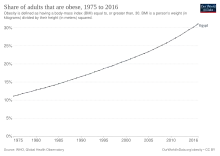 In 1996, Egypt had the highest average BMI in the world at 26.3.[26] In 1998, 1.6% of 2- to 6-year-olds, 4.9% of 6- to 10-year-olds, 14.7% of 10- to 14-year-olds, and 13.4% of 14- to 18-year-olds were obese. 45% of urban women and 20% of the rural population were obese.[27]