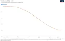 In early 2005, the WHO reported that Ethiopia had 119 hospitals (12 in Addis Ababa) and 412 health centres.[28] Infant mortality rates are relatively high, as 41 infants die per 1,000 live births.[29] Ethiopia succeeded in reducing its under-five mortality rate by two-thirds (one of the Millennium Development Goals) between 1990 and 2012.[30] Although this is a dramatic decrease, birth-related complications such as obstetric fistula affect many of the nation's women.[31]